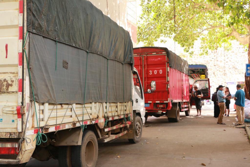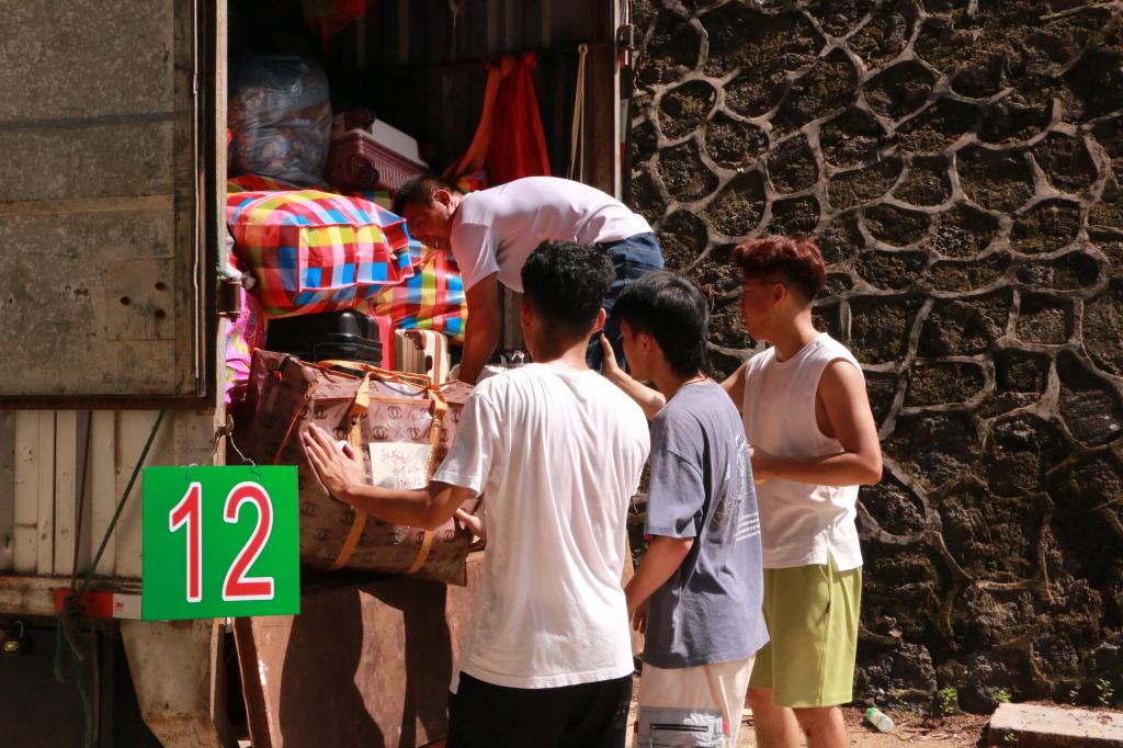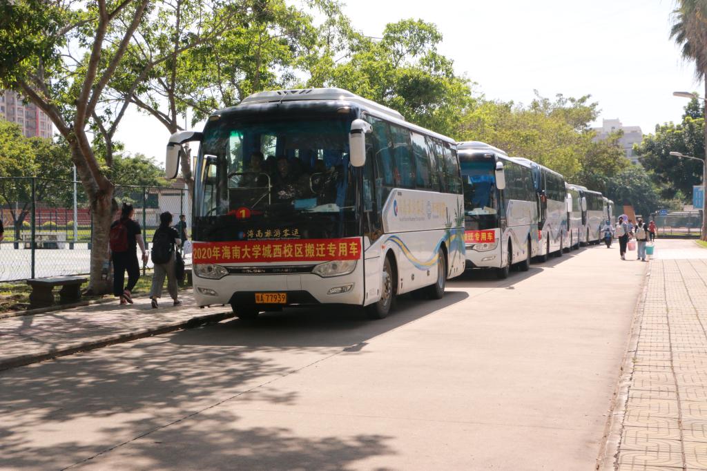 在城西校区,中午过后学院同学们已经陆续将自己收拾好的行李搬下楼,期间随处可见同学们互帮互助的身影,尽管烈日炎炎,友爱互助却足以让沉重的搬迁工作轻松几许。按照学院部署,下午14时将行李搬下宿舍楼,在女多男少的人文传播学院,男生们自发提前收拾行李帮助女生搬迁。15时,学院货车在城西校区宿舍楼下整齐列队,货车司机师傅、老师学生们一齐将行李装车。搬迁同时,同学们亦注重文明行为,将自己的宿舍打扫干净,为即将到来的新生留下整洁舒适的环境。随后,学生们与跟车老师一起到教学楼前乘坐客车,16时,搬迁车队发车前往海甸岛。