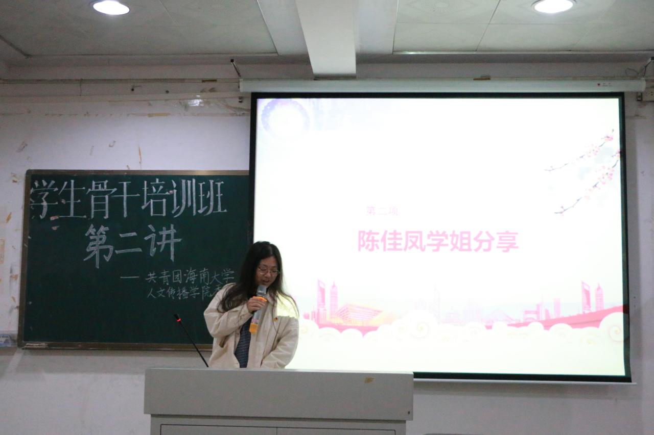 在分享过程中,吴维泽从我的大学、团学干部、设计思维和学会复盘四个方面讲述了身为学生干部应如何做好本职工作,并在平衡学习与工作的同时,丰富多彩地度过大学生活。他指出,作为学生干部,要不忘初心、牢记使命,面对困难要勇于挑战,从过去获得力量。而后,施雅馨结合自己在学生组织中的经历,分享了学生组织工作中可能遇到的问题和解决方法。她期望,同学们的眼光能放长远,并祝愿他们在团学事业和学业上双丰收。最后,陈佳凤通过分享自身的故事告诉同学们要勇于选择、苦中作乐、在理解中进步、在无畏中成长。她告诉同学们,既然选择了,就不要再害怕,既然决定了,就坚定地走下去。