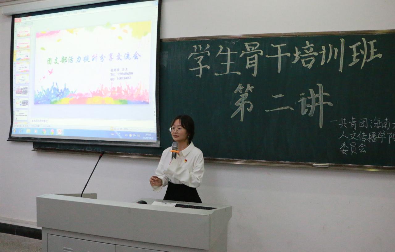 随后,石玉基于自身担任团支书兼班长的经验,分别从学习、生活、工作三个方面,讲述了如何建设氛围良好的团支部。她提出,建设一个优秀的、和谐团结的团支部,既需要支委会发挥引领带头作用,又需要提高同学们参与集体活动的积极性,提升同学们的归属感、参与感。