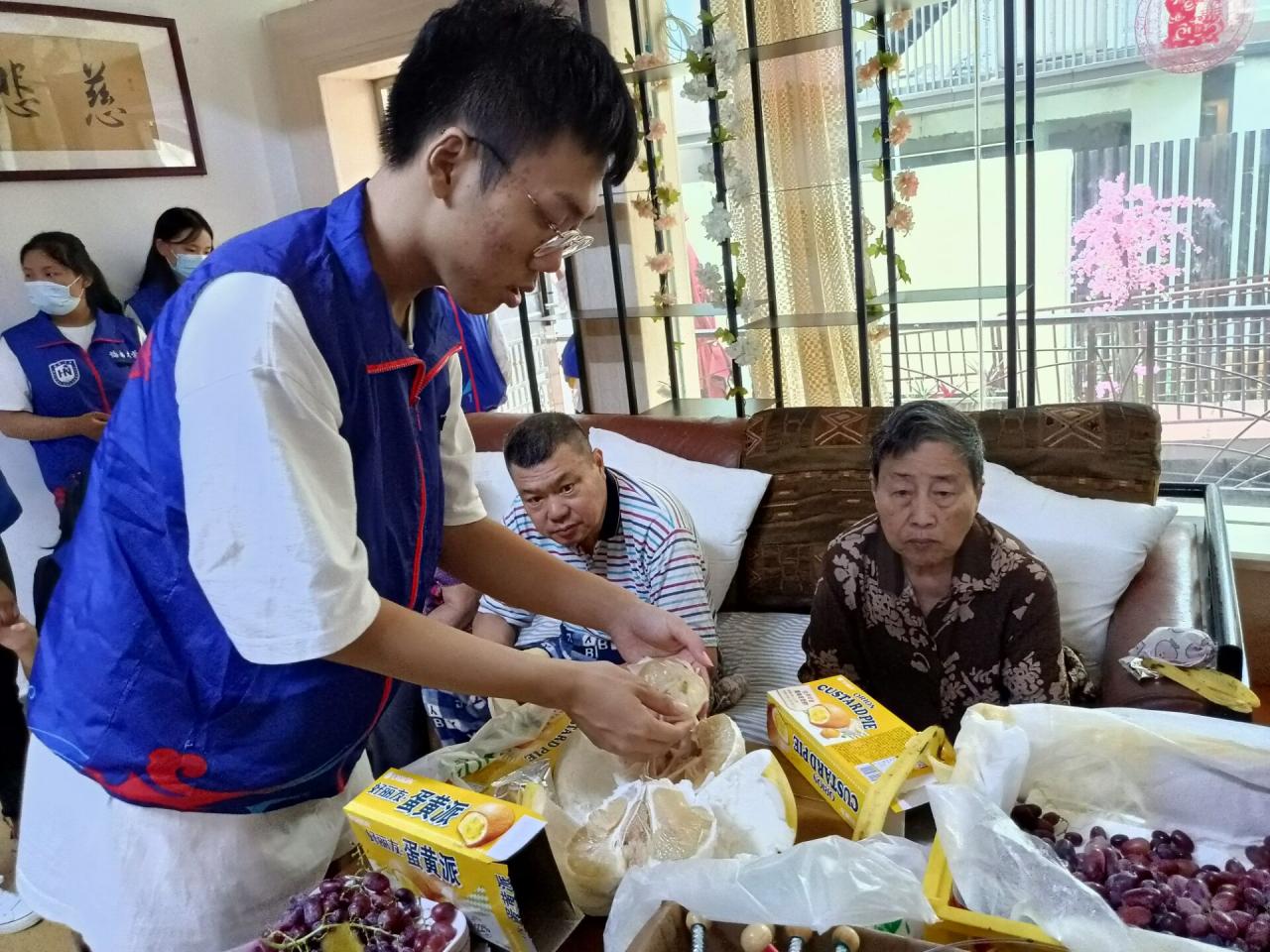 志愿者们表演着为老人们精心准备的节目,老人们亦陶醉在这场视听盛宴。悠越歌声与秋日和风相融,现场一派融洽祥和,稚嫩热忱的面庞与慈蔼温和的笑容互相铭刻在每个人的心底。表演结束后,志愿者们将提前准备好的鲜润水果和特别礼物送给了老人们,他们感到十分惊喜并为此动容,非常感谢志愿者们带去的礼物。表演结束后,志愿者们去到老人们身边,伏膝倾听他们过去的故事,与他们一起轻唱昔日歌谣,唤起了老人们内心深处的美好记忆。