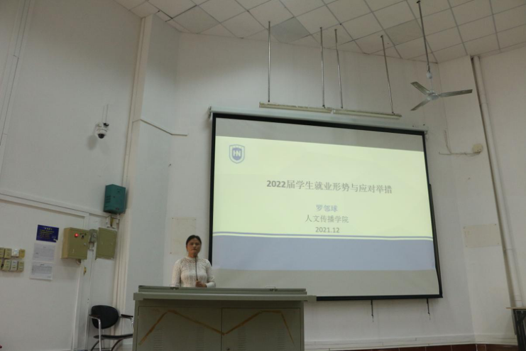 会议第三项,党委副书记罗邻球对2022届学生就业形势与应对措施进行了相关讲解,她通过数据的对比指出同学们存在的问题并明确了落实就业的意义,并向同学们提供了有关保就业的应对举措。她指出,同学们要正确认识严峻的就业形势,抓住关键点,不能让自己停下来,共同携手打赢这场就业攻坚战。