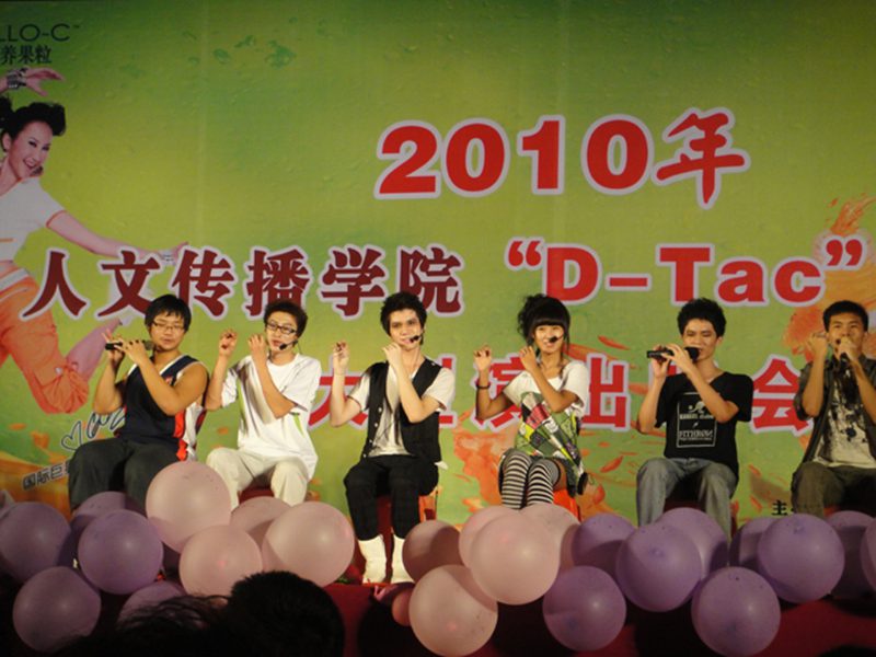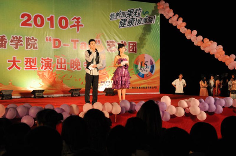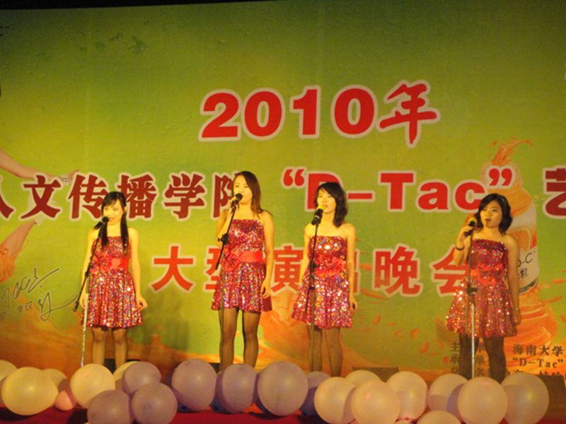 4月10日晚7:30,人文传播学院“D—Tac”艺术团在起点草坪举办了组团以来的首次汇报演出。出席此次晚会的有学院党委孙晓媛副书记,学工办主任苏文魁老师,团委书记谢庚全老师,学工办公衍峰老师和助理辅导员王远露。此次汇报演出由哇哈哈独家赞助,娃哈哈海口特约经销商陈总、胡经理、林经理以及各兄弟学院的学生会主席和部长观看了演出。