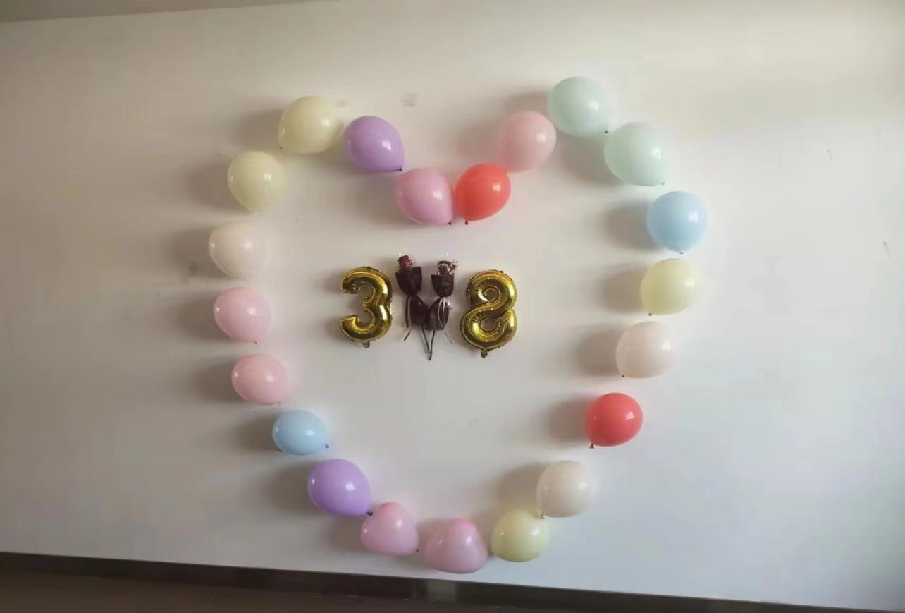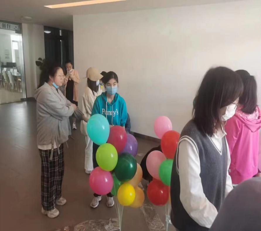 侨中美丽沙分校不仅注重学生们的日常学习与成长,也重视学生们全方面综合素质发展,更是注重关心关爱教师,2023 年 3 月 8 日,在侨中实习的同学集体参与美丽沙分校妇女节的节日策划与现场布置,同学们协助老师们共同吹气球、贴气球、贴横幅等为老师们布置充满节日氛围的食堂。