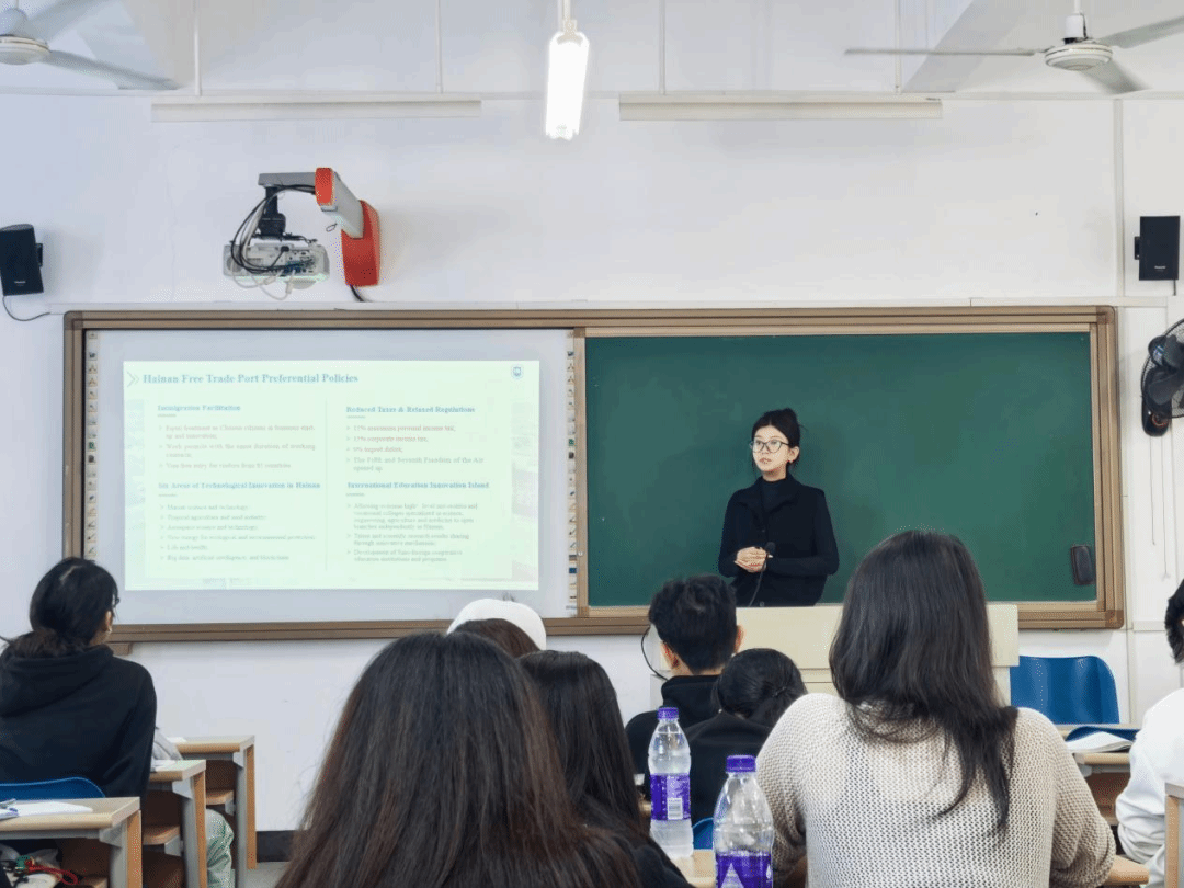 国际商学院国际合作交流中心副主任陈世佩老师向在场学生生动展示了国际商学院的概况。他介绍了面向国际学生的招生专业和学院开展的各类留学生活动,分享了优秀国际校友的相关事迹。