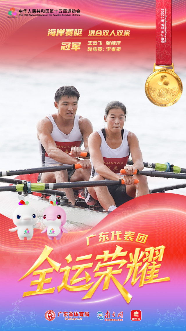 在11月16日上午结束的十五运会海岸赛艇混合双人双桨决赛中,广东运动员王云飞、张桂萍战胜对手,勇夺冠军。这不仅是本届全运会的首枚海岸赛艇金牌,也是全运会历史上首枚海岸赛艇项目金牌。