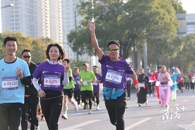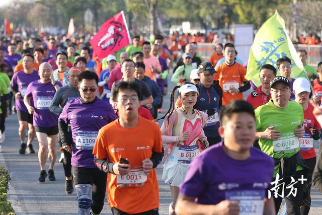 上午8时,随着发令枪响,穿着各色参赛服的选手们涌向赛道,纵情奔跑。跑者们一边大步向前冲,一边挥舞双手朝道路两旁的摄像镜头和观众大喊“加油”,赛道外的观众更回报以热情的加油呐喊声。