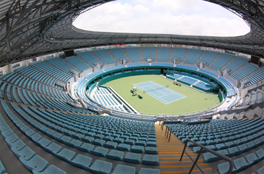 网球中心位于广东奥林匹克体育中心西北面,由一栋开敞式网球主比赛馆、一栋副馆和13块室外标准网球场以及相关附属用房组成,总占地面积约为56398.66平方米,总建筑面积约为20962平方米,总投资人民币1.8亿元。主馆座位数为9534个、副馆座位数为1845个。停车场车位有80个。