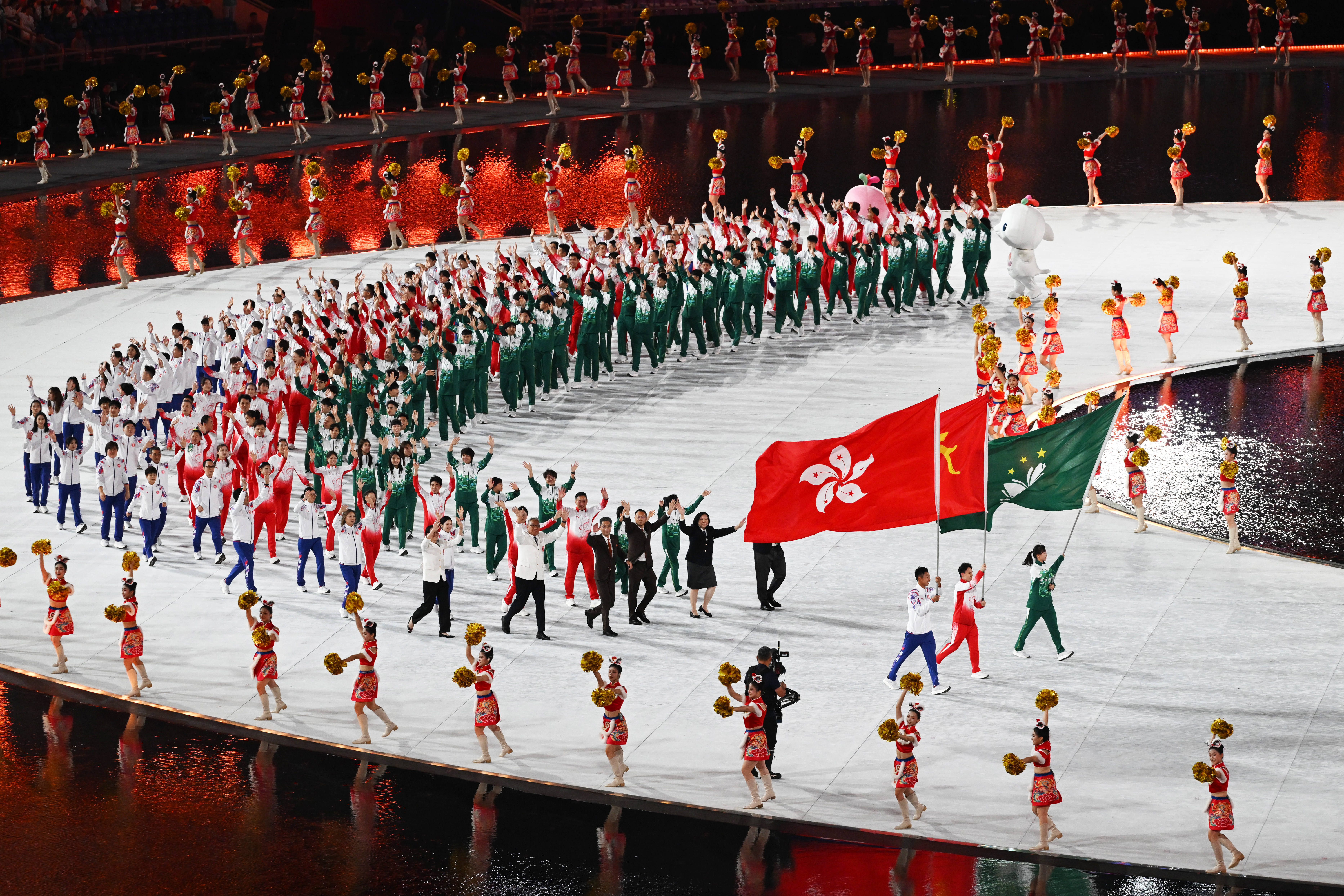 广东省体育代表团、香港特别行政区体育代表团、澳门特别行政区体育代表团在第十五届全国运动会开幕式入场仪式上共同入场 图/新华社