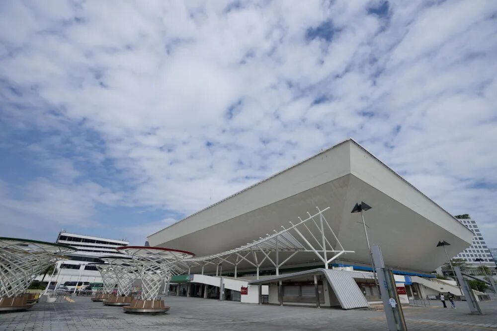 ↑位于广州的广东省奥体中心游泳跳水馆外景(10月17日摄)。全运会跳水、水球比赛在这里举行。新华社记者 毛思倩 摄