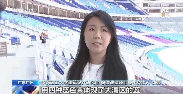华南理工大学建筑设计研究院 奥体改造项目技术负责人郭嘉:我们在座位的一个设计上,用四种蓝色来体现了大湾区的蓝,在这四种蓝的基础上呢,我们又加入了广东的木棉红,还有香港的紫荆紫,澳门的青莲绿色。所以把这三种颜色又融入我们四种蓝色当中去,整体体现了一种动感、活跃、开放、融合的视觉的效果。