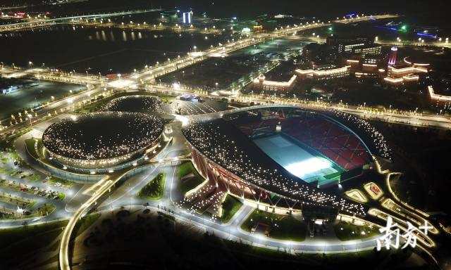 目光往东,肇庆新区体育中心盛装待旦,三个场馆屋顶星光点点,如繁星倒映。今夜守候于此的幕后英雄们一定难以入眠。