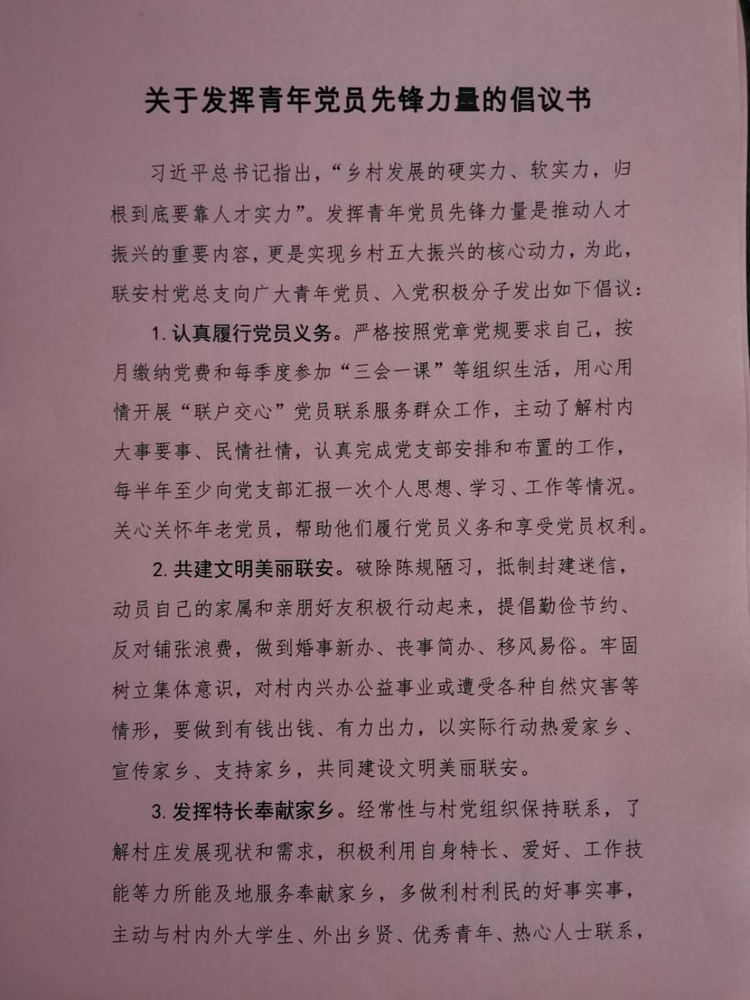 随后驻村党建指导员李楠同志宣读关于发挥青年党员先锋力量的倡议,引导青年党员发挥特长助力联安发展。