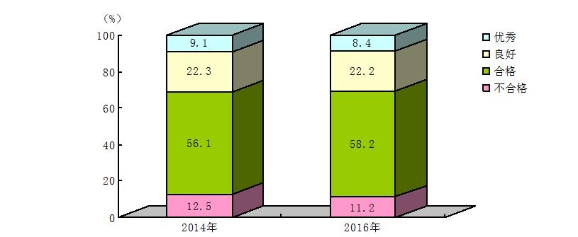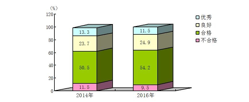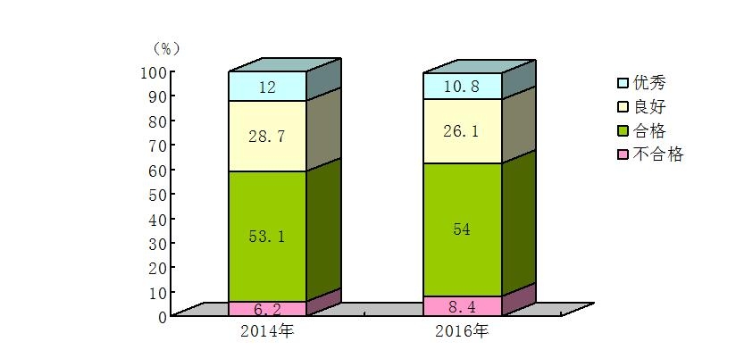 2016年广东省幼儿体质优秀率为10.8%,比2014年下降了1.2个百分点;良好率为26.1%,比2014年增长了2.6个百分点;达到“合格”等级以上的百分比为91.6%,比2014年下降了2.2个百分点(图2)。