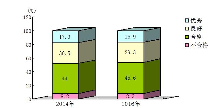 2016年广东省20~39岁成年人体质优秀率为16.9%,比2014年下降了0.4个百分点;良好率为29.3%,比2014年下降了0.7个百分点;达到“合格”等级以上的百分比为91.7%,比2014年增长了1.5个百分点(图3)。