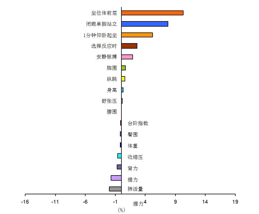 0~39岁女性的身高、胸围、安静脉搏、舒张压、握力、坐位体前屈、1分钟仰卧起坐、纵跳、闭眼单脚站立、选择反应时等指标有所增加,幅度在0.2%~10.3%之间;体重、臀围、收缩压、肺活量、台阶指数、握力、背力等指标有所降低,幅度在0.1%~2.0%之间(图9)。