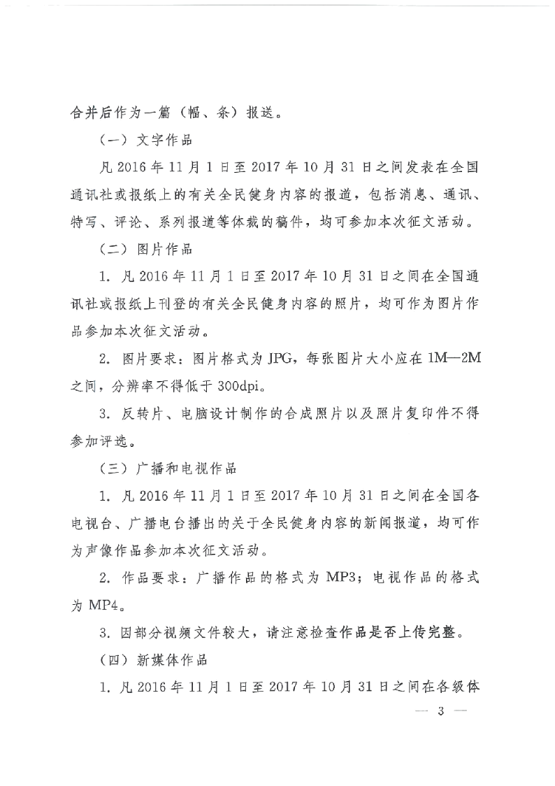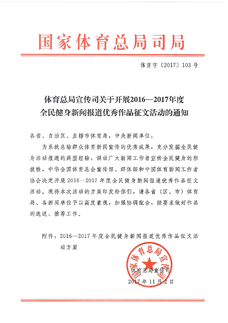 体育总局宣传司关于开展2016——2017年度全民健身新闻报道优秀作品征文活动的通知