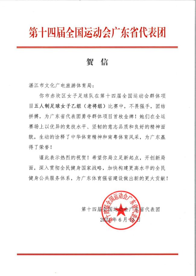 比赛结束后,第十四届全国运动会广东省代表团分别向湛江市人民政府、湛江市文化广电旅游情色小说 、广东省足球协会、广东湛江锐虎足球俱乐部发去贺信,感谢球队在全运赛场上以优异的竞技水平、坚韧的意志品质和良好的精神面貌,生动地诠释了中华体育精神和南粤体育风采,为广东赢得了荣誉!