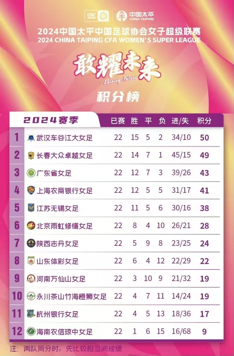 9月28日下午,2024女超联赛第22轮6场比赛同时开战。最终,广东队在客场0比3不敌江苏队,以2分的优势力压上海队获得联赛季军,前锋袁丛也以13球成为联赛最佳射手;而武汉队则在主场1比0小胜陕西队,以1分的优势收获女超5连冠。至此,本赛季女超联赛收官。