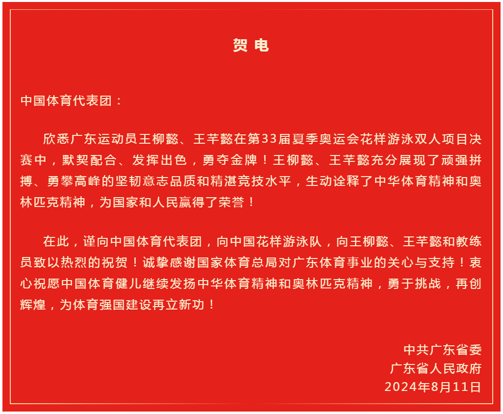 王柳懿、王芊懿巴黎奥运会花游双人项目夺金,广东省委省政府向中国体育代表团致贺电