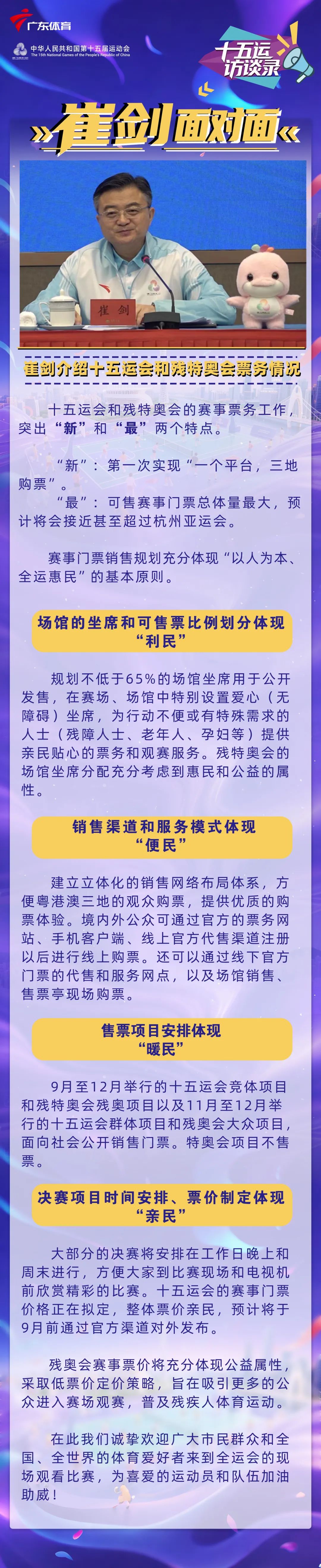 崔剑介绍,十五运会和残特奥会赛事票务工作本着“统分结合、因地施策,以人为本、全运惠民,依法依规、公正透明”的原则,突出“新”和“最”两个特点。“新”是指,本届全运会是首次由粤港澳三地共同举办,在赛事票务销售方面,第一次实现“一个平台,三地购票”;“最”是说,本届全运会是历届全运会规模最大的一届,赛事可售门票总量预计将会接近,甚至超过杭州亚运会。