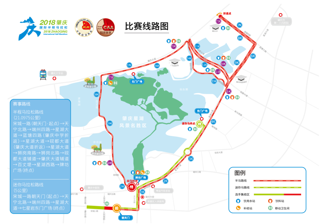 四是医疗保障继续升级。为保证每一位参赛选手,都能顺利安全地完赛,2018肇庆国际半程马拉松赛的医疗保障与往年相比将会有较大升级。组建现场医疗保障专业队,分别设置为以下医疗单元:专家组、医疗组、应急救援服务组、空中救援组、医师跑跑团等等。共设置19个医疗点,分别在赛事起点设2个,迷你马拉松终点设置3个,“半马”终点设置3个,另沿赛道每2.5km设置1个,10km起每1.5km设置一个医疗组。每个医疗组分别配置2名医生(急诊科、心血管科、外科、骨科)、2名护士(急诊科、ICU)、2名辅助医疗志愿者等设备。18km后每500m设置一个加强医疗组。还会设有辅助医疗志愿者250人,赛道沿途每100米安排一名,及时发现在赛道中发生的突发情况,并及时与骑行移动救护员对接。去年医疗保障团队为500多人,今年则超过800人。